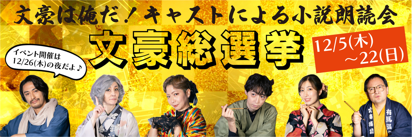 劇団6番シード第79回公演『文豪が多すぎる』に於いて、終演後イベント「文豪は俺だ!キャストによる小説朗読会」を実施するにあたり、以下のとおり文豪総選挙を実施いたします。